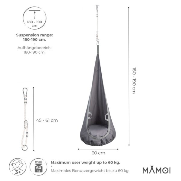 Die Firma MAMOI zeichnet sich durch hohe Qualität ihrer Produkte aus. Diese erfüllen auch die strengen Sicherheitsanforderungen und Normen. Die hängesack kinderzimmer eignet sich für jeden Raum. Bei der Herstellung werden keine chemischen Schadstoffe, Farbstoffe oder Reinigungsmittel verwendet. Die hängeschaukel kinderzimmer ist ein ökologisches Produkt. Die hängesessel kinder ist im zeitlosen Design.