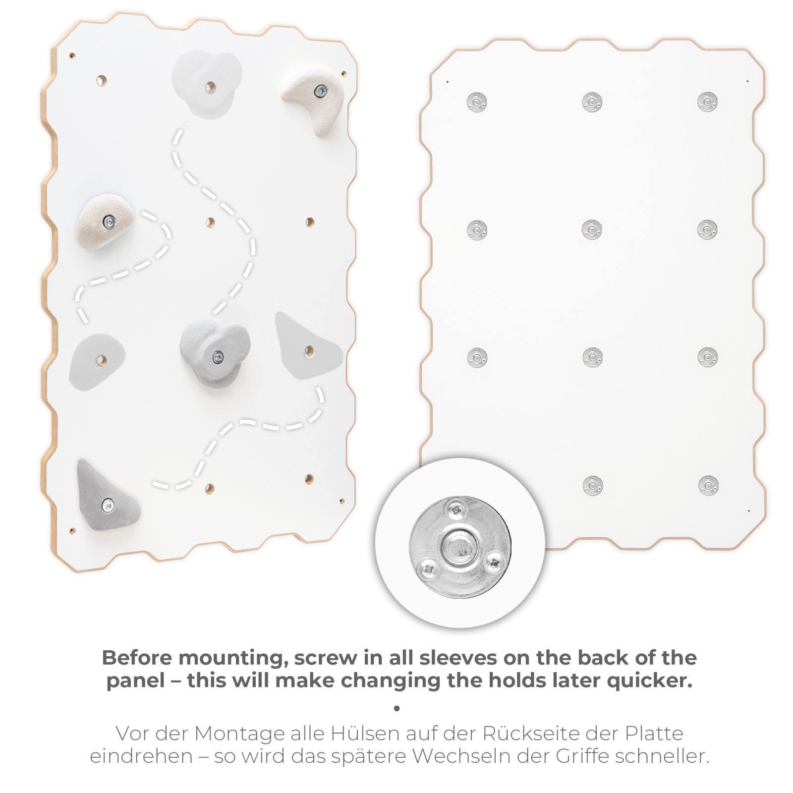 ✔ Einfache Montage – Die Kletterwandmodule für den Innenbereich bestehen aus einer langlebigen Holzwerkstoffplatte mit einer Stärke von 18 mm in Weiß. Vorgebohrte Löcher ermöglichen eine schnelle und stabile Befestigung der Klettergriffe, während die Kanten präzise mit CNC-Technologie geschnitten wurden.