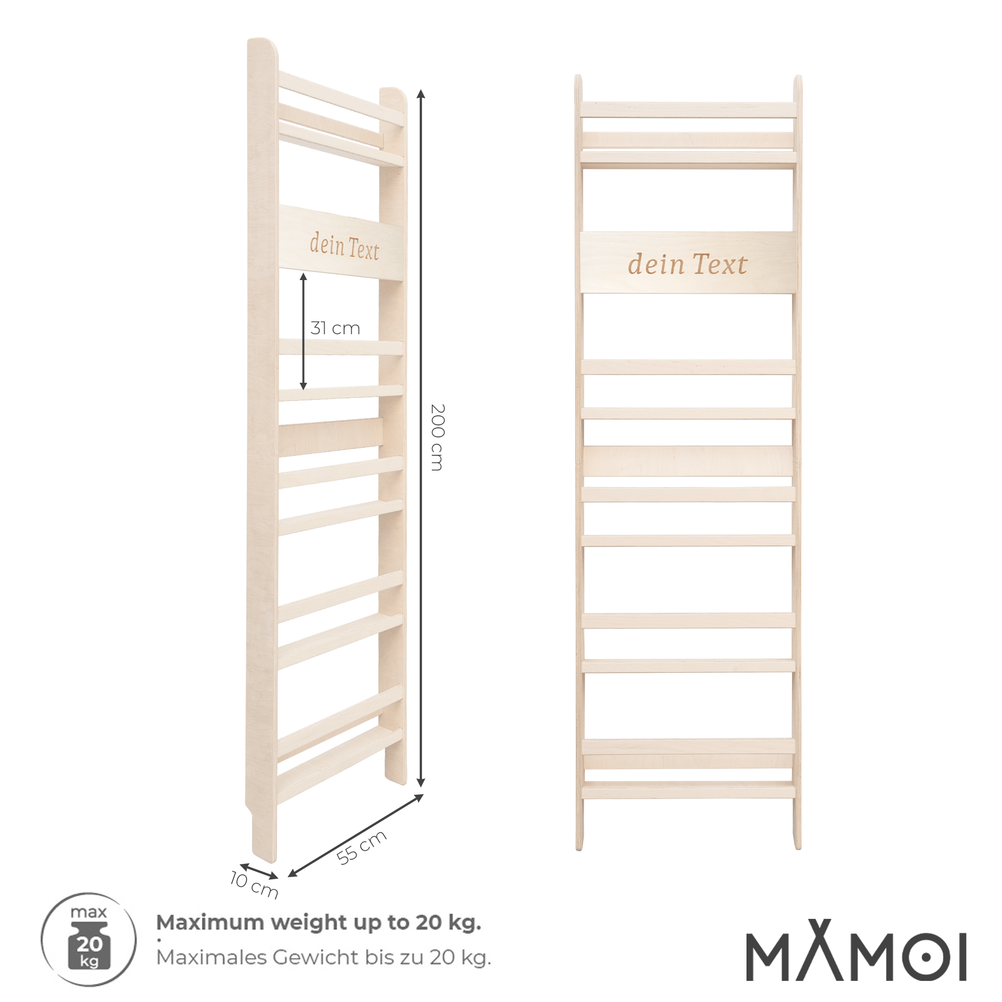 Nach dem Montessori-Prinzip fördert dieses Regal die Selbstständigkeit des Kindes und hilft, Ordnung zu halten. Zudem kann das Regal mit einer Personalisierung von bis zu 16 Zeichen versehen werden – etwa mit dem Namen des Kindes oder einem kurzen Schriftzug, was ihm eine persönliche Note verleiht.
