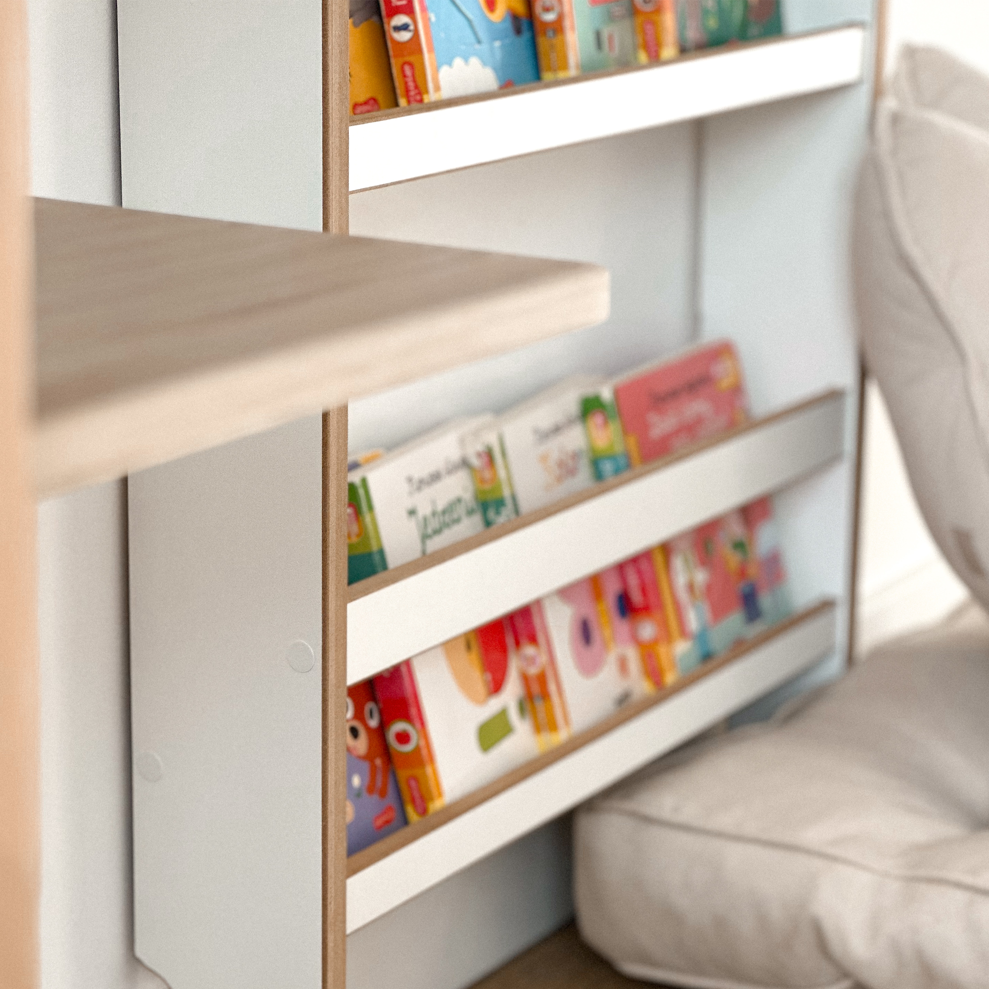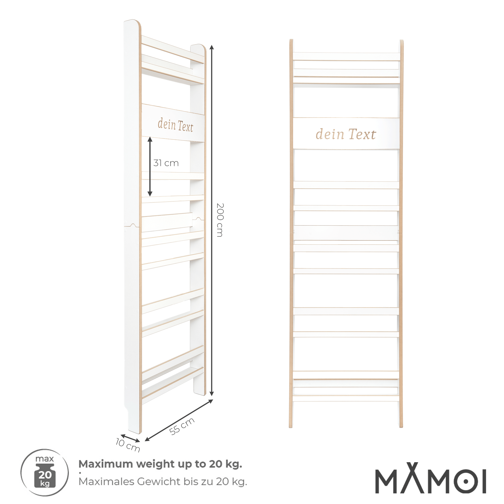 Unser MAMOI® Kinderregal vereint Funktionalität und Design und ist ein unverzichtbares Möbelstück im Kinderzimmer. Gefertigt aus Holzwerkstoffplatte, bietet es eine praktische und stilvolle Aufbewahrung für Bücher und kleine Schätze.