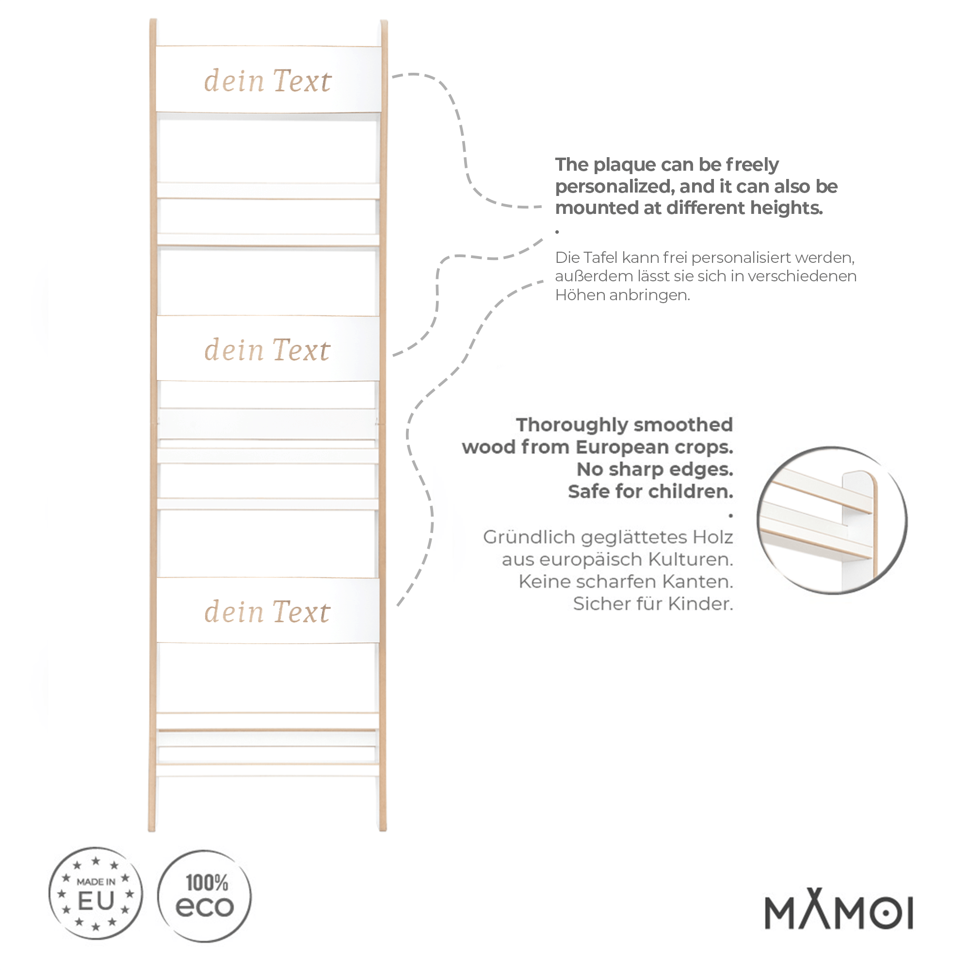 Nach dem Montessori-Prinzip fördert das Regal die Selbstständigkeit und Verantwortungsbewusstsein des Kindes. Zudem ermöglicht es eine Personalisierung von bis zu 16 Zeichen, beispielsweise mit dem Namen des Kindes oder einem kurzen Schriftzug, was ihm eine individuelle Note verleiht.