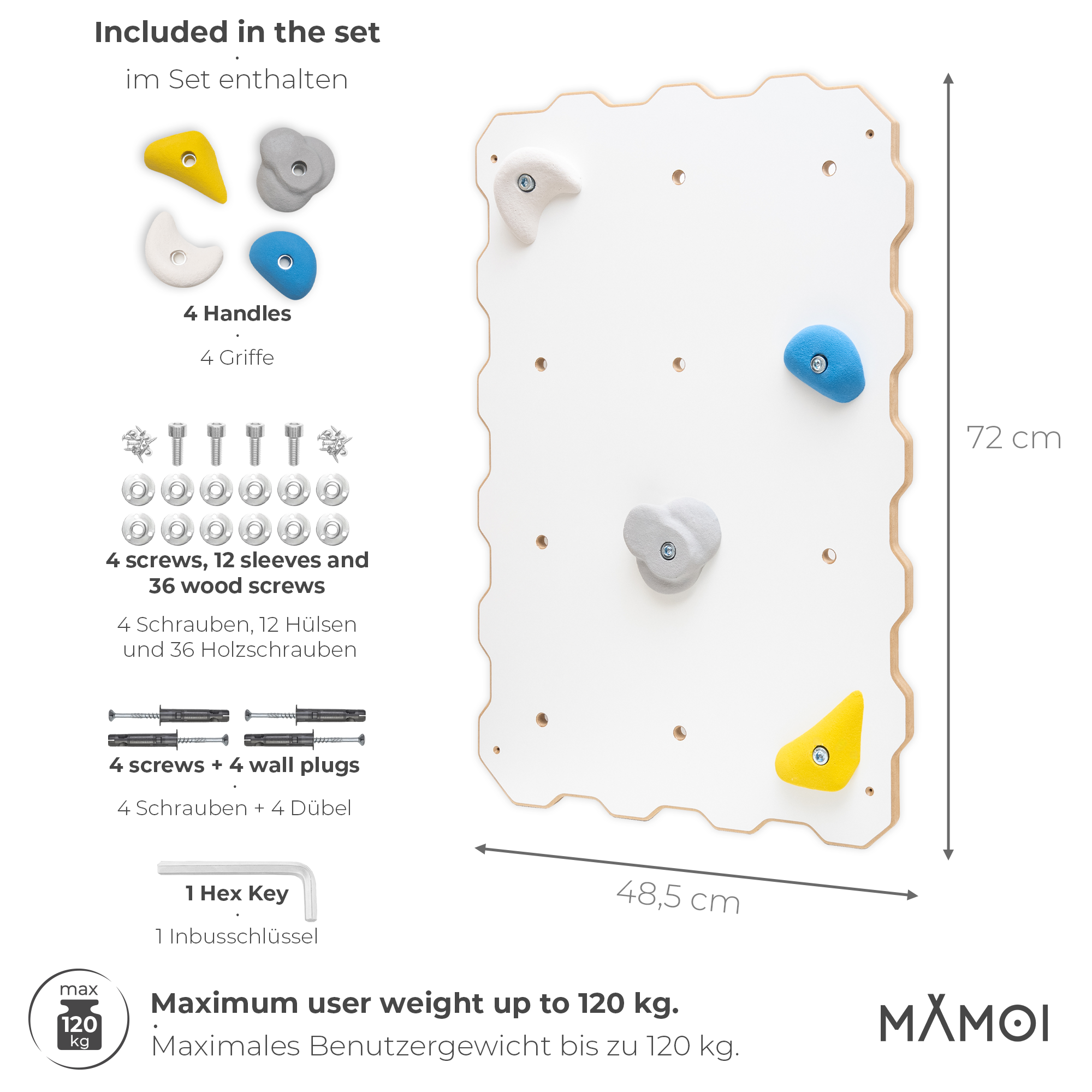 MAMOI® Kletterwand aus Holz für den Innenbereich mit 4 Klettergriffen, weißes Kletterwand-Modul, Indoor-Kletterset für zu Hause, Kletterwand zur Selbstmontage