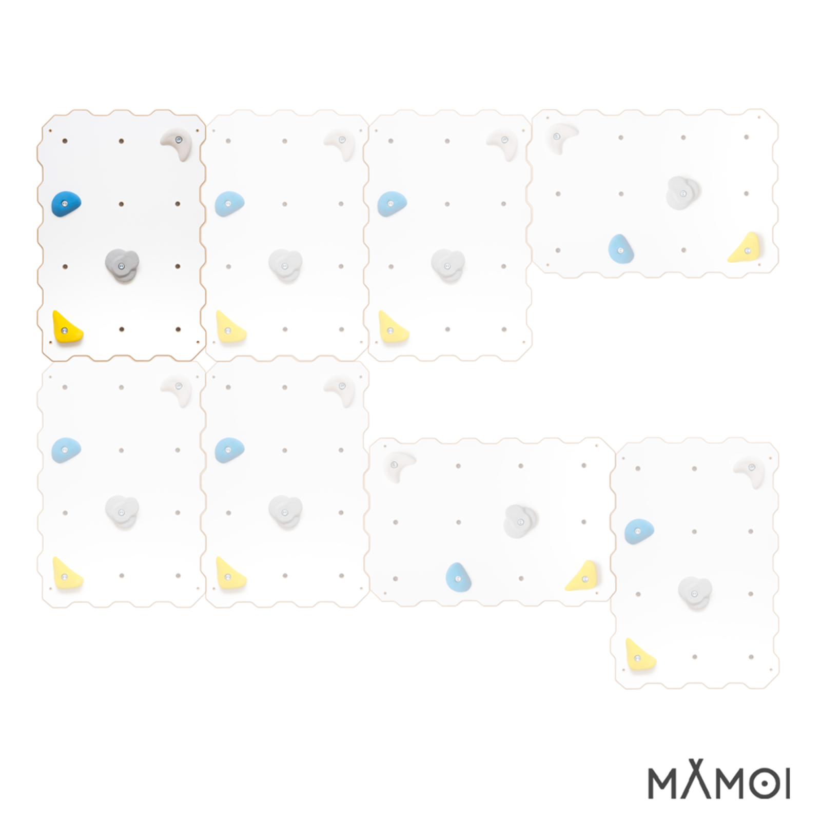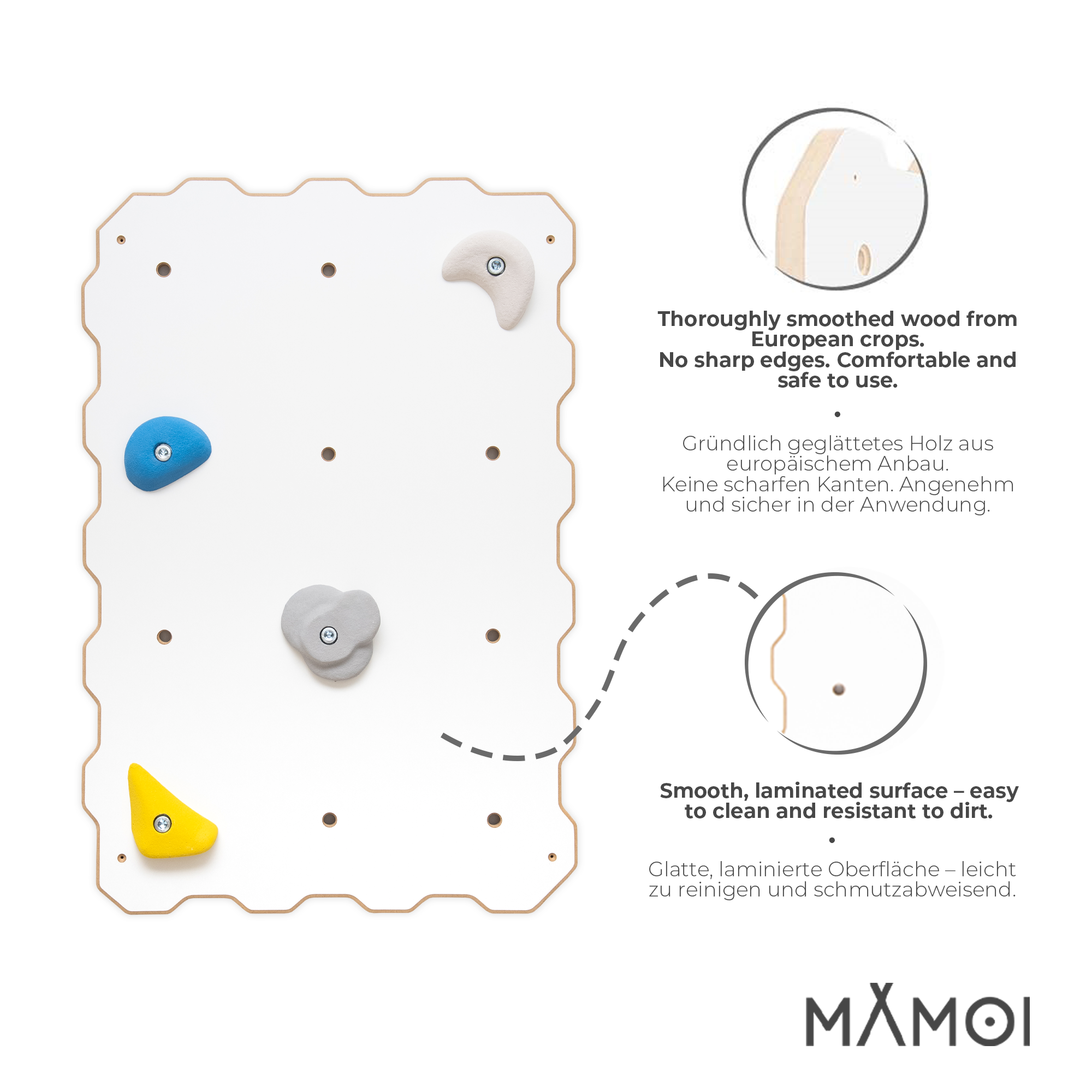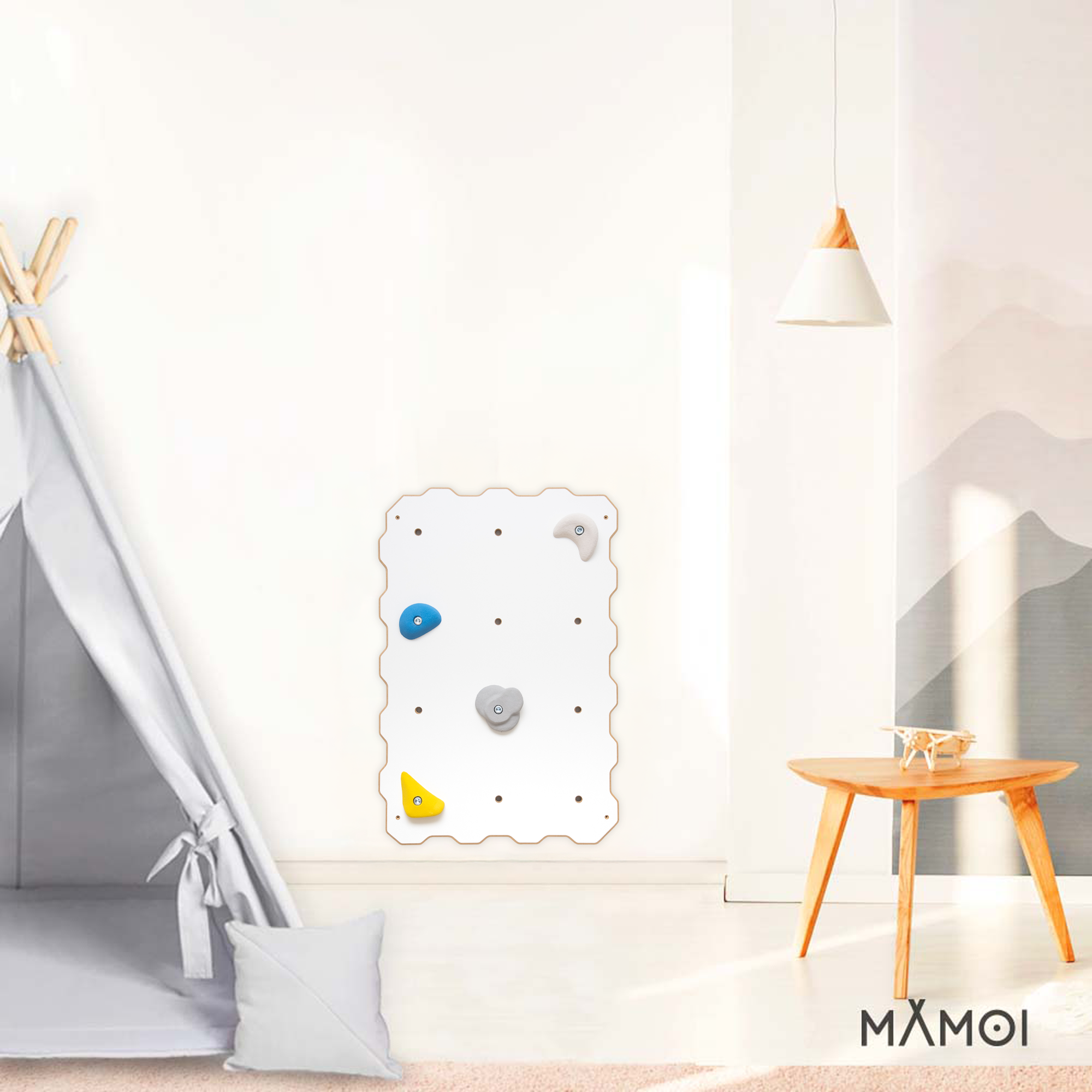 Die Griffe werden zufällig ausgewählt und versendet, wodurch jede Kletterwand ein einzigartiges Aussehen erhält. Alle Kanten und Bohrungen wurden mit CNC-Technologie präzise gefertigt und geglättet, was maximale Sicherheit bei der Nutzung garantiert. Die glatte Oberfläche des Paneels ist leicht zu reinigen und schmutzabweisend. Der wellenförmige Rand ermöglicht es, mehrere Module miteinander zu verbinden und die Kletterwand beliebig zu erweitern. Das Design passt ideal zu skandinavischen, modernen und minimalistischen Innenräumen.