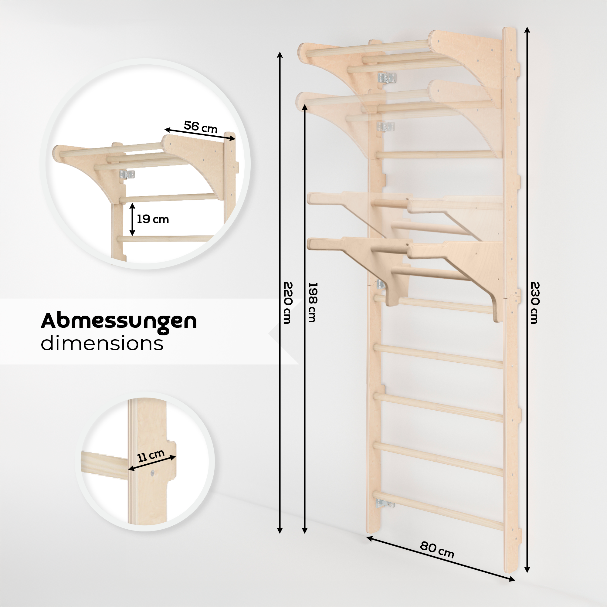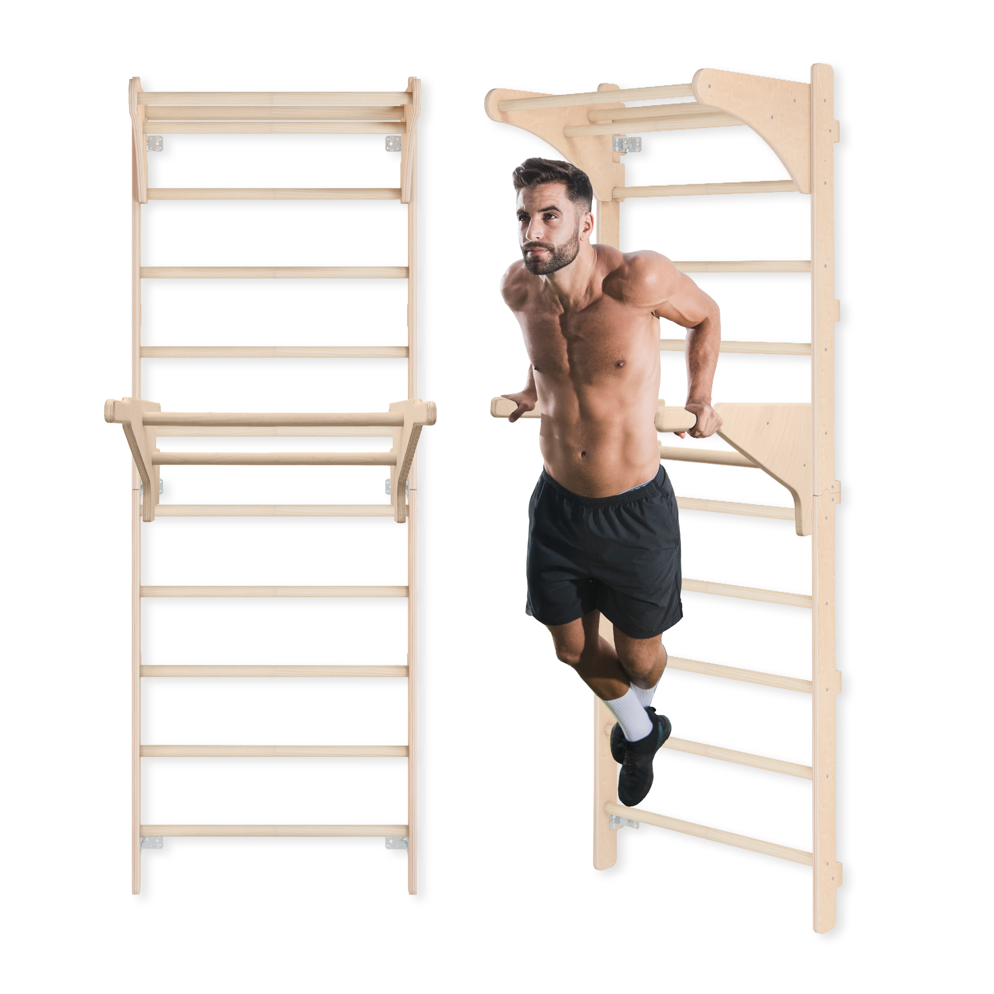 Zubehör bestehend aus Gymnastikleiter, Griff und Dip-Barren bildet eine vielseitige Trainingsstation für Kraft-, Stabilisations- und Dehnübungen. Die an der Wand montierte Leiter dient als stabile Basis und gewährleistet Haltbarkeit sowie Widerstandsfähigkeit bei intensiver Nutzung. Die Dip-Barren können auf jeder Sprosse befestigt werden, sodass die Höhe an Trainingsart und persönliche Vorlieben angepasst werden kann und ein breites Spektrum an Übungen für den Oberkörper ermöglicht wird. Der Griff dient als zusätzliches Trainingselement und eignet sich für Klimmzüge, Hängeübungen sowie Übungen zur Kräftigung des gesamten Körpers, während seine glatte Oberfläche und ergonomische Form Komfort und sicheren Halt bieten. Die Konstruktion aller Elemente wurde so entwickelt, dass sie Stabilität während des Trainings gewährleistet und natürliche Bewegungsabläufe unterstützt. Durch die Möglichkeit, Zubehör umzusetzen, kann der Nutzer verschiedene Konfigurationen erstellen und das Set an individuelle Trainingsziele anpassen. Das Set wurde so gestaltet, dass es wenig Platz einnimmt und gleichzeitig zahlreiche Kraft-, Mobilisations- und Koordinationsübungen ermöglicht. Es ist eine praktische Lösung für alle, die einen funktionalen Trainingsbereich zu Hause schaffen möchten, ohne große, komplexe Geräte zu verwenden, und bietet dennoch einen großen Bewegungsumfang sowie die Möglichkeit eines effizienten Ganzkörpertrainings.