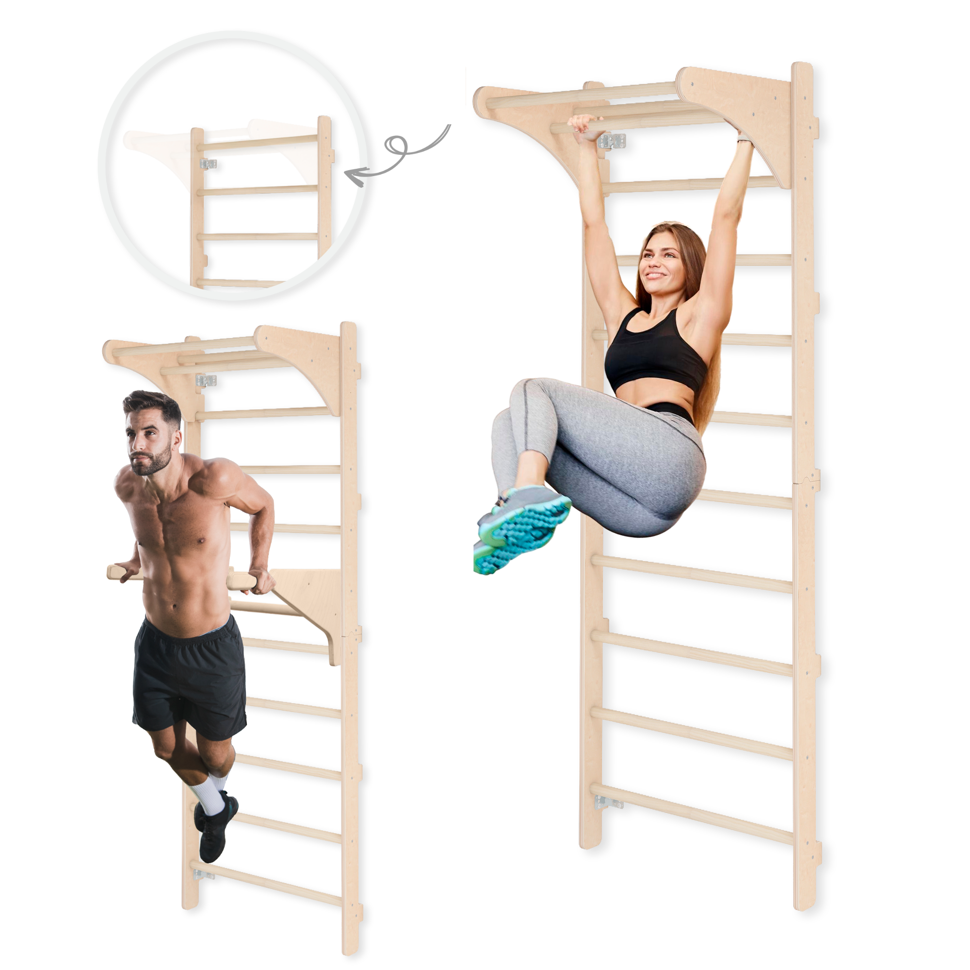 ✔ Verstellbare Dip-Barren und Griff – Die Dip-Barren sowie der Griff können in verschiedenen Höhen an der Leiter befestigt werden, sodass ihre Position an die ausgeführten Übungen und persönliche Vorlieben angepasst werden kann. Die Verstellung ermöglicht zahlreiche Trainingskonfigurationen, darunter Klimmzüge, Dips, Stützpositionen und Übungen zur Kräftigung des Oberkörpers.
