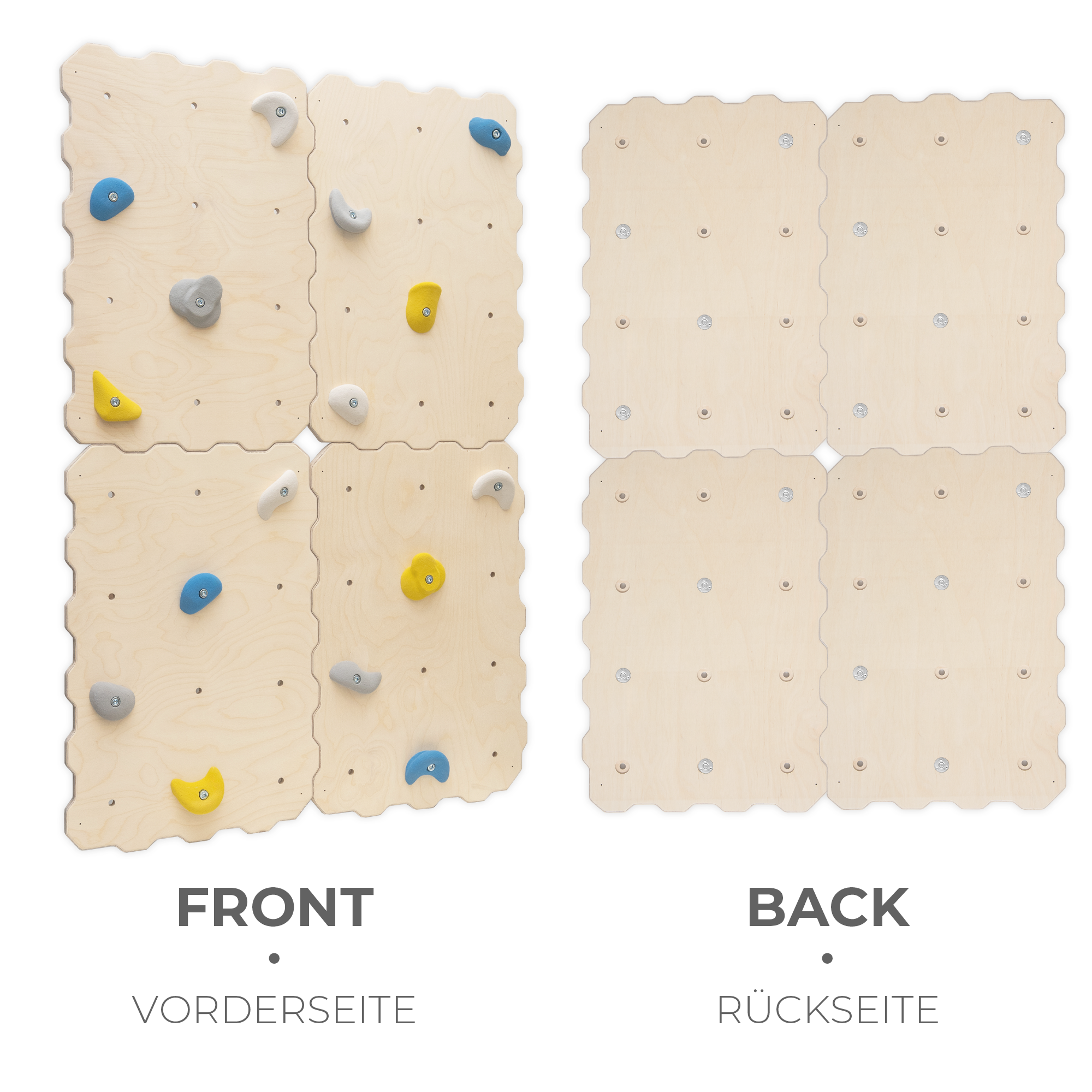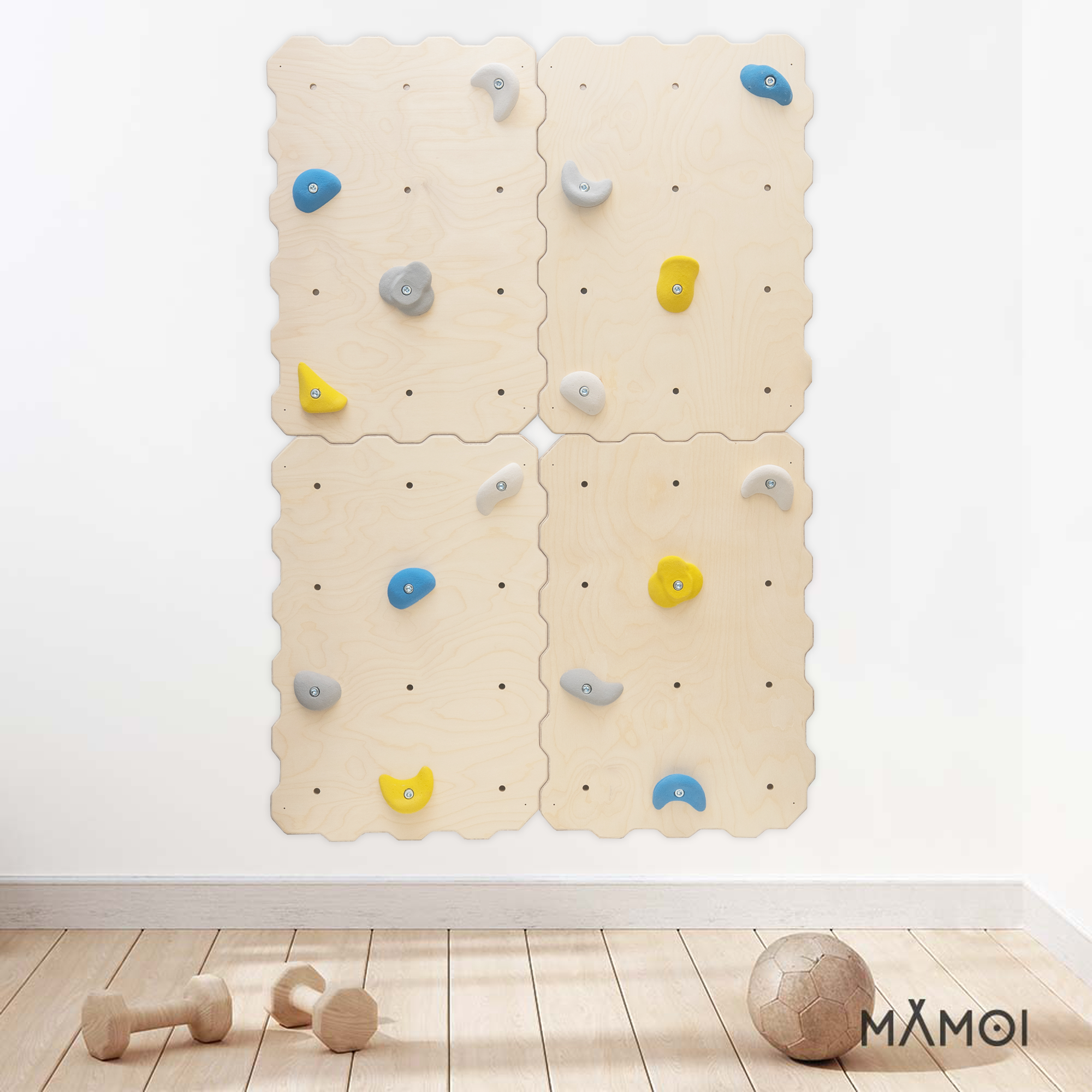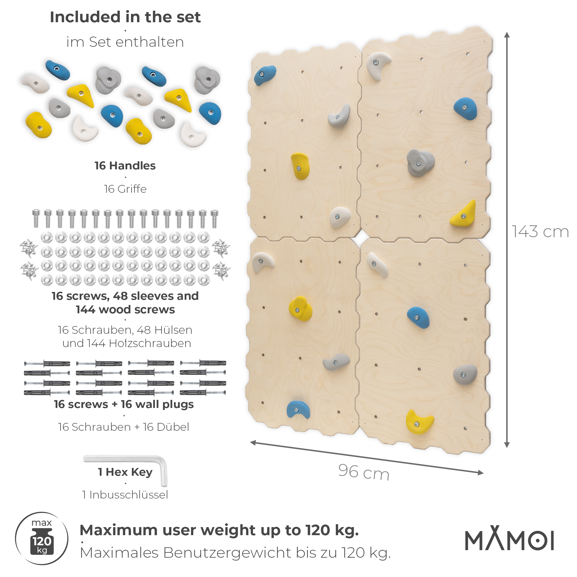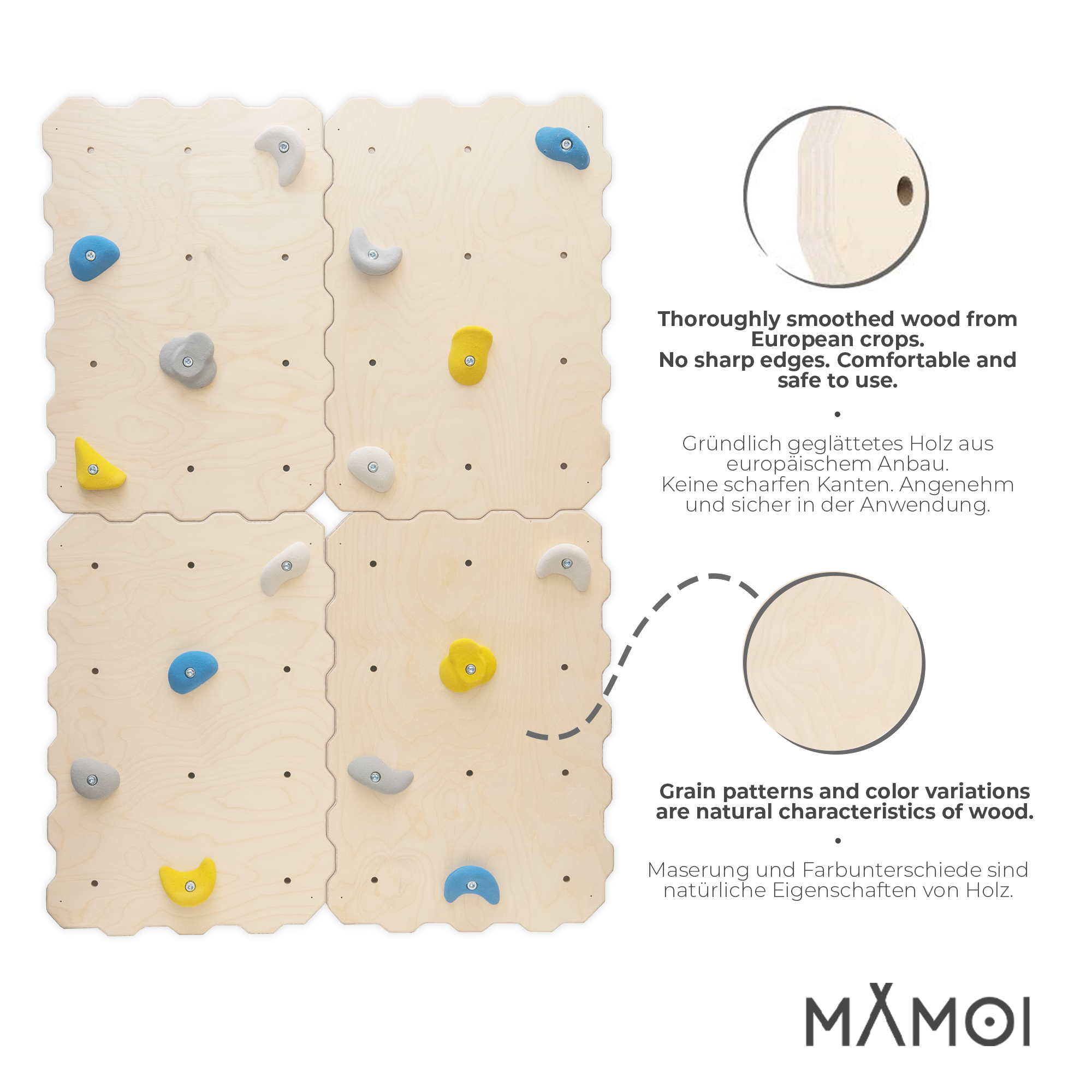 MAMOI® Wooden climbing wall for indoor use with 16 climbing holds | Climbing set with panels and holds | Wooden layered board | Home climbing wall for self-assembly