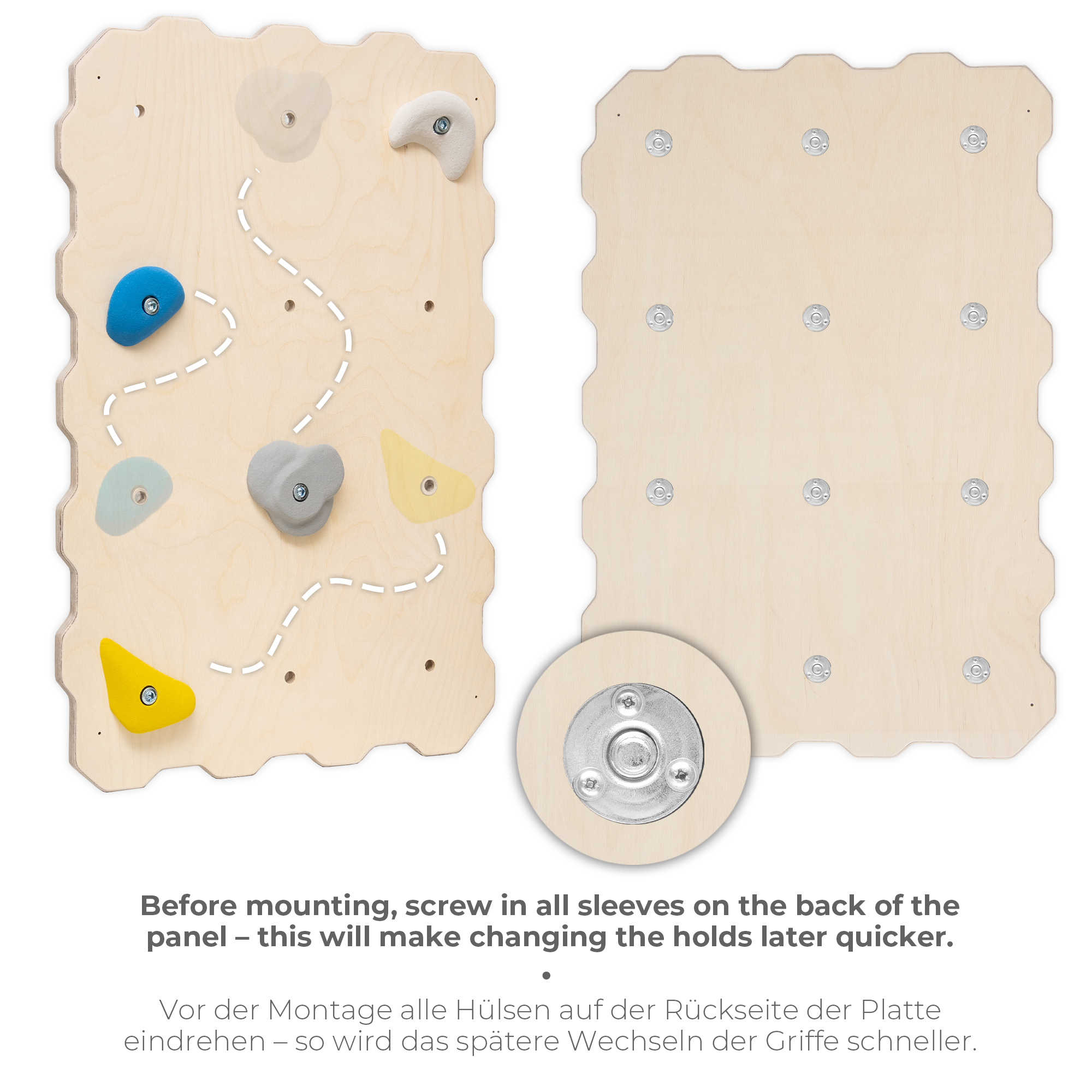 The holds provide a secure and comfortable grip, and all components are mounted with solid metal screws and sleeves included in the set. The natural surface of the layered wooden board is finely sanded, making it smooth, pleasant to touch, and safe to use – without sharp edges.