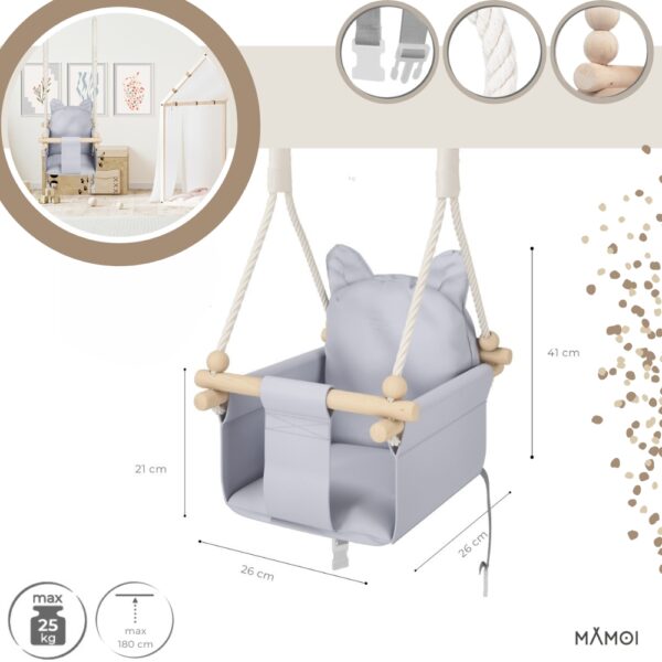● Skandynawska huśtawka wewnętrzna dla dzieci MAMOI jest w 100% bezpieczna dla Twojego maluszka. Do produkcji nie użyto chemikaliów, materiałów toksycznych ani alergenów.
